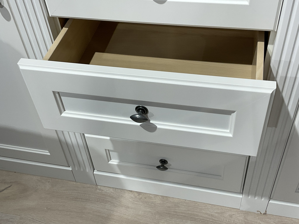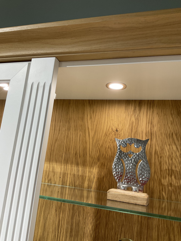 1004 GFront: Lack weißAbsetzungen: Asteiche furniertGriff: M 8 Zinnmit KlarglasB 172 x H 197 x T 30/45 cmmit LED Spots 6,6 KW pro 1000 Std.ohne Dekoration!ABHOLPREIS!