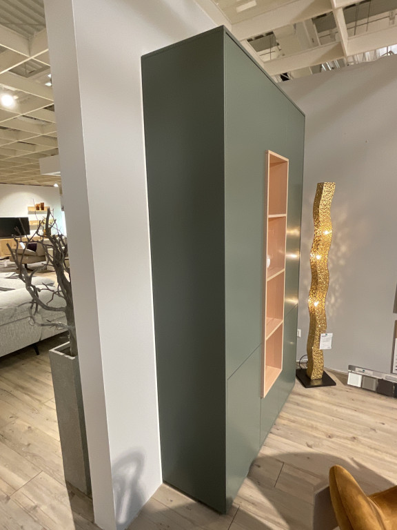 Front + Korpus: Lack piniengrün mattAbsetzung: KristallbucheB 131 x H 217 x T 41,5 cmOhne Griff, Push to open!mit LED- Beleuchtung E - Fmit Funkempfänger und Fernbedienungohne Dekoration! ABHOLPREIS !