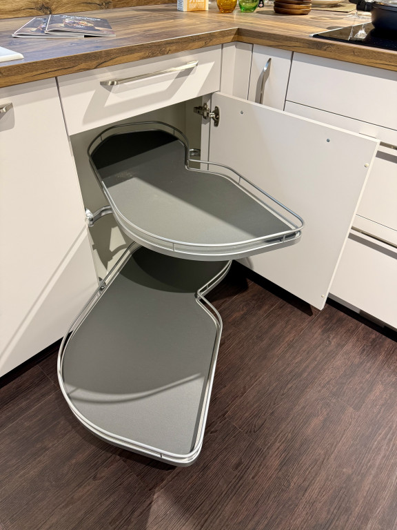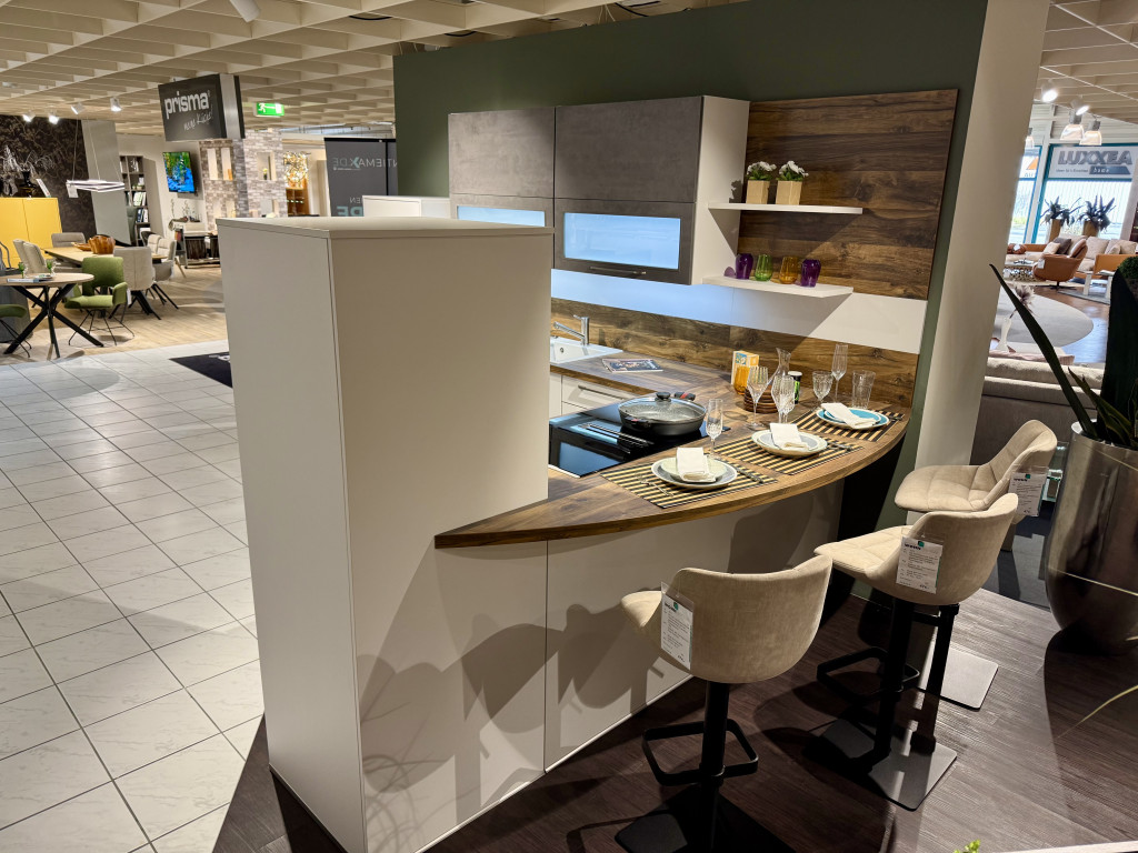 Hochwertige Einbauküche in L-Form, Front Melaminharz beschichtet, ca. 352 x 249 cm, gerundeter Tischüberstand in Thekenhöhe, Unterschränke mit XL-Korpus und Arbeitshöhe 93 cm, inklusive Elektrogeräte von Neff und Keramikspüle mit massivem Edelstahl-Einhebelmischer von Villeroy & Boch, Lifttür für Standmikrowelle (nicht enthalten) über Backofen, Faltklappenschränke mit Leuchtböden und vieles mehr.