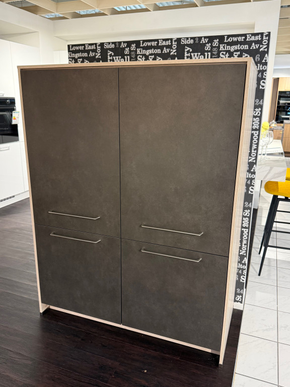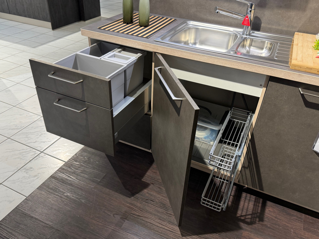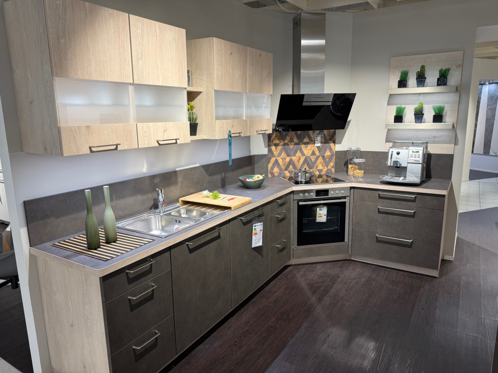 Hochwertige Einbauküche in L-Form mit Herd in 135°-Ecke, Front Melaminharz beschichtet, ca. 317 x 187 cm, separat stehender Highboard-Block (B: 123.2 cm, kann auch angebaut werden), Arbeitshöhe ca. 86 cm cm, inklusive Elektrogeräte von Neff und Einbauspüle mit Einhebelmischer von Franke, separater Abfallsorter direkt unter der Arbeitsplatte, Putzmittelauszug im Spülenschrank, Leuchtböden und vieles mehr.