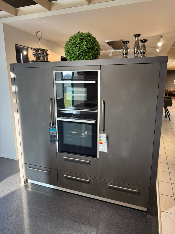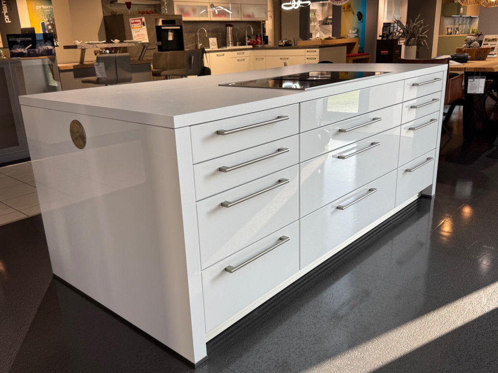 Sehr hochwertige Einbauküche mit hochglänzend lackierten Fronten in Kristallweiß und Akzentfronten in Lacklaminat Stahl dunkel mit Antifingerprint-Oberfläche, bestehend aus drei Elementen: Spülenzeile (B: 332 cm), Kochinsel (232 x 110 cm) und Highboard-Block (B: 192 cm), extra hohe Unterschränke, Arbeitshöhe ca. 92 cm, inklusive Induktionskochfeld mit integriertem Dunstabzug von Berbel, Backofen mit Dampfunterstützung "Vario Steam", Dampfgarer, Kühlschrank und Geschirrspüler von Neff, Design-Edelstahlspüle und massiver Edelstahl-Bogenmischer von Franke, Faltklappenschränken und vielem mehr.